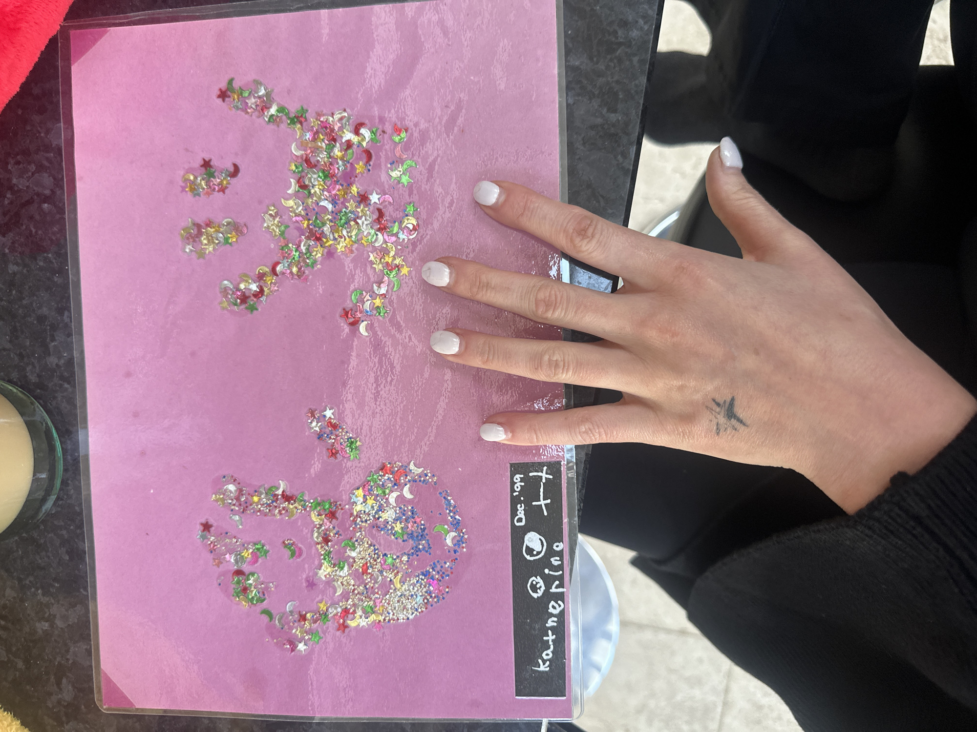 A hand with white nail polish is resting on a pink laminated sheet with glitter outlines of a handprint
