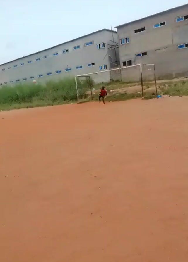 soccer field with a red-dirt surface and a single soccer goal. A young person wearing a red shirt practices goal keeping by leaping to catch a ball. The background shows a long grey building with blue windows and some vegetation. The sky is overcast. The video was shot on an Awesome A05s device.