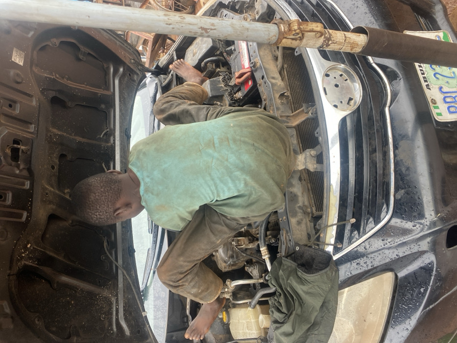 In Nyanya, Abuja, Nigeria, an outdoor, informal vehicle repair scene is depicted