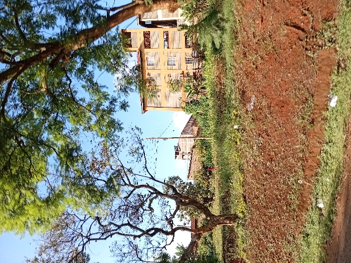 A medium-shot shows a building in the background, partially obscured by lush green trees. The foreground features a large tree with many branches, partly obscuring the sky. A patch of brown dirt with some green vegetation is visible on the side. The building appears to be an apartment with multiple windows. The sky is blue with some white clouds. The overall scene evokes a sense of nature amidst urban life.