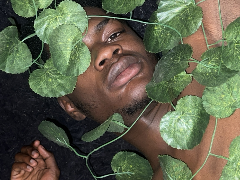 A dark-skinned individual is depicted in a close-up shot, lying supine on a dark, textured surface in Udu, Nigeria. The subject's face is partially covered by a decorative vine of artificial green leaves. The right eye is open and directed towards the viewer, with the nose and full lips clearly visible. Sparse facial hair is present on the jawline and chin. The subject's bare chest is visible beneath the foliage, and a left hand rests on the dark surface in the upper-left portion of the frame. The setting appears to be an indoor or controlled environment with soft, direct lighting against a dark background.