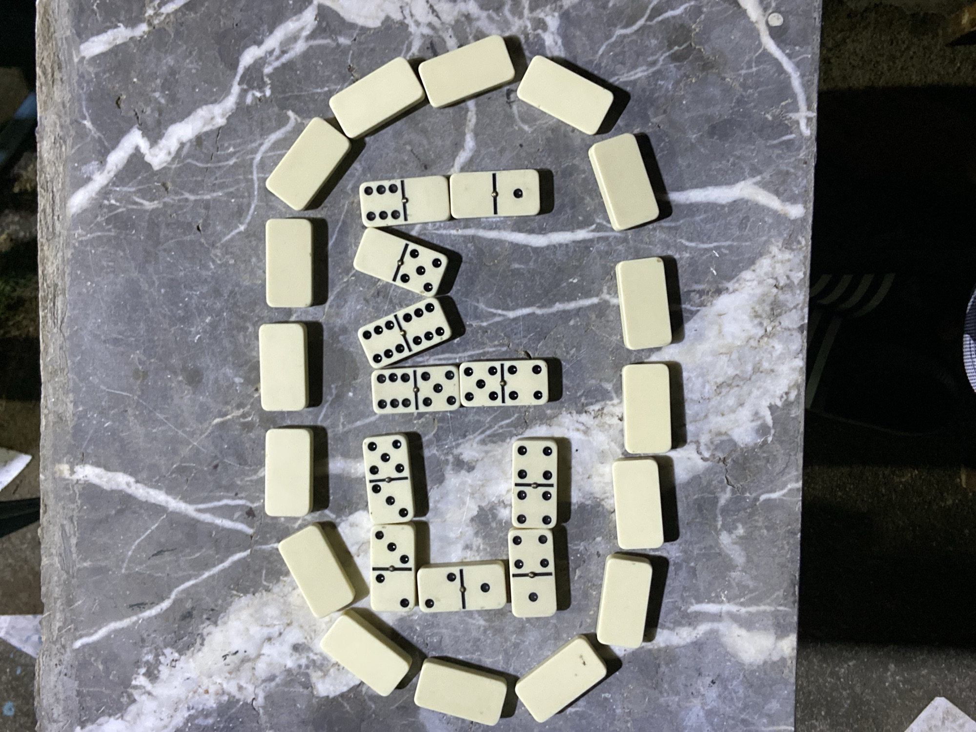 collection of dominoes arranged in a circle, with some dominoes placed within the circle to form a shape that resembles a number 6. The dominoes are set on a surface that looks like a marble or stone table with a gray and white marbled pattern. The location appears to be outdoors, judging by the lighting, shadows, and blurry details of nearby vegetation. The image does not provide any information about the location in the city of Los Velásquez, Venezuela, or any information about people, subjects, actions, or interactions.