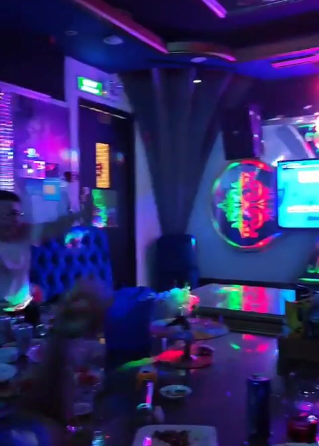 inside of a karaoke room. There's a table laden with food and drinks, reflecting the room's colorful lighting. A man stands in front of a karaoke screen holding a microphone, seemingly ready to sing. Other people are sitting around the table. The room is lit with a mix of pink, blue, and green neon lights, and the karaoke screen displays the word "BREAKFAST" on it. The atmosphere appears festive and casual.