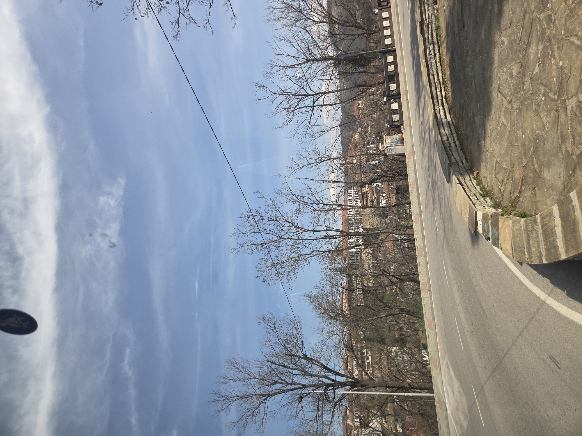 The image depicts a daytime, wide-angle view of a curving asphalt road in the hilly city of Veliko Tarnovo, Bulgaria, likely taken from inside a moving vehicle given a circular reflection/decal in the upper sky and faint smudges on the road. The sky is bright blue with scattered white, wispy clouds. A dark, thin power line stretches horizontally across the upper right quadrant. In the immediate foreground, a multi-tiered stone retaining wall, constructed from light-brown, rectangular blocks, curves sharply to the right, following the contour of the road. Beyond this wall is an irregularly paved area of flagstones. The asphalt road itself features two lanes delineated by broken white lines, with a solid white line marking the right edge of the roadway. Faint, reddish-brown stains are visible on the left side of the road surface. The midground is dominated by numerous bare deciduous trees, characteristic of late winter or early spring, which partially obscure the background. To the left of the road, a concrete utility pole stands, and a black metal barrier with decorative square panels lines the roadside. Behind the trees, a dense urban landscape unfolds on the hillsides, featuring numerous multi-story buildings with light-colored (predominantly white or beige) facades and distinctive orange-tiled roofs. No people or animals are visible, and no discernible actions or interactions are taking place.