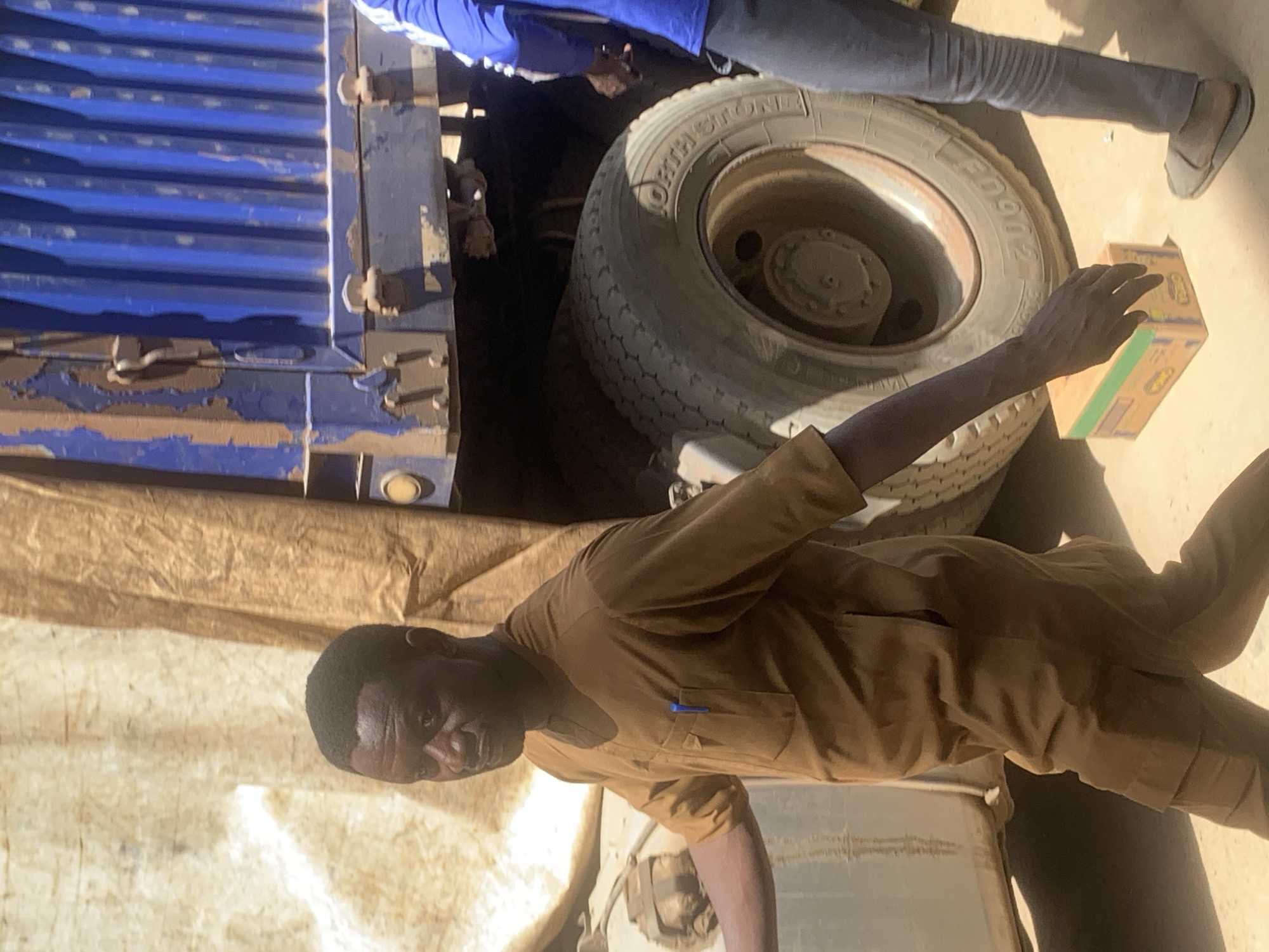 The scene is an outdoor, daylight environment in Fagge C, Nigeria, characterized by an unpaved, dusty ground surface. In the central foreground, an adult male of African descent, with short dark hair, is captured in mid-stride, moving from left to right. He wears a short-sleeved, brown tunic with a collar and a left chest pocket holding a blue pen. His gaze is directed towards the camera. To the immediate right, a second individual is partially visible, wearing a blue long-sleeved shirt, dark trousers, and a brown sandal on their left foot. In the background, two large vehicles are present. On the right, a heavily weathered blue truck, exhibiting corrugated side panels, significant rust, and paint degradation, is parked. One of its large rear tires, bearing the brand "ORTHSTONE," is prominent. On the left, a lighter-colored vehicle is partially obscured by a tan canvas tarp. A small, rectangular cardboard box, featuring green and orange accents, rests on the ground between the central figure and the partial figure on the right. The central figure's right hand is positioned near, but not touching, this box. No direct interaction between the individuals is depicted.