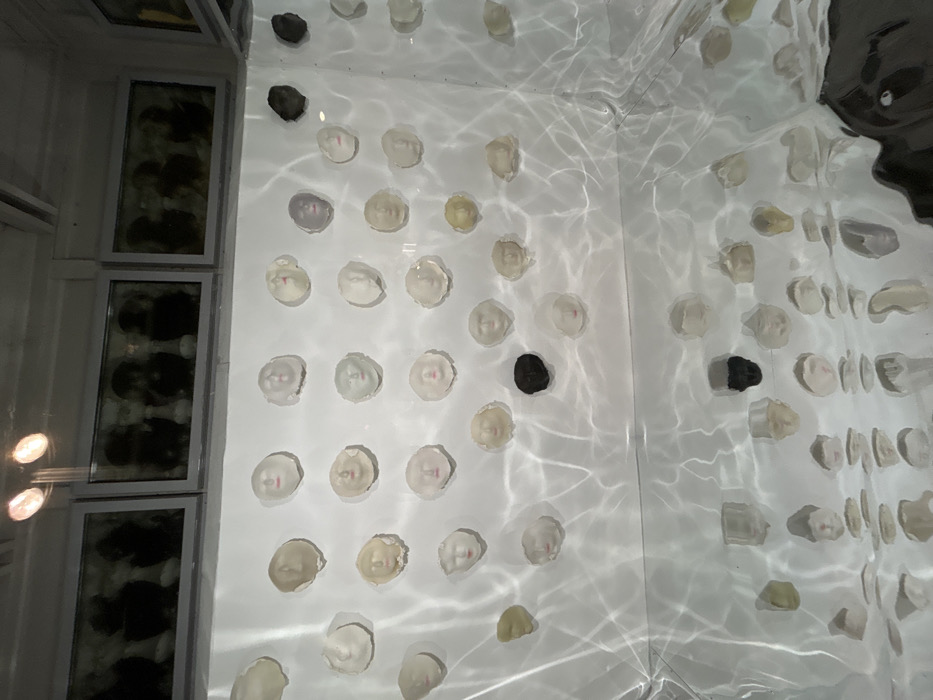 An interior view showcases two adjacent white walls adorned with numerous face-like sculptures