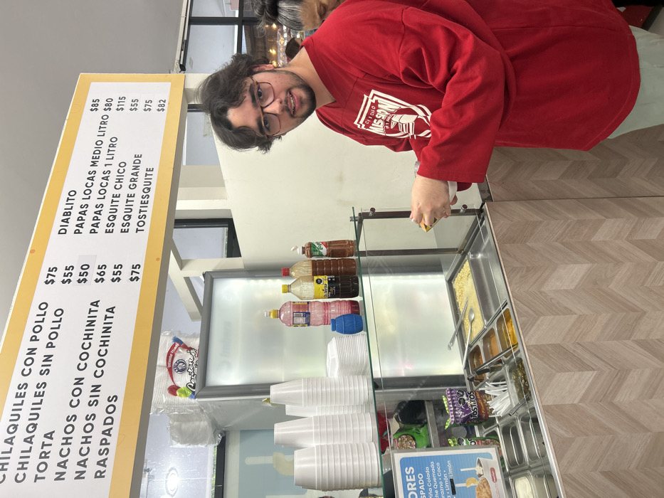 A man wearing glasses and a red sweater stands behind a food stall. The stall has a menu board listing items like "Chilaquiles con Pollo," "Nachos con Cochinita," "Diablito," and "Esquite." Prices are displayed next to each item. Containers, some filled with food items, are visible in the stall's display case. Bottles of condiments are arranged on a shelf. Cups are stacked on the counter.