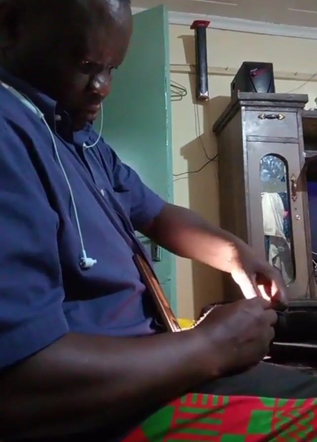 dark-skinned man in a blue shirt and headphones sitting in a room with a cabinet and a green door. He is focused on something in his hands that is illuminated by a bright light, possibly a phone screen or another light source, which is casting light onto his hands and face. The man is wearing red and green patterned pants. The cabinet behind him appears to be made of metal, and a black speaker sits on top of it. There is a long, cylindrical object hanging on the wall behind the cabinet. The room's walls are painted cream and have a simple pattern near the ceiling.