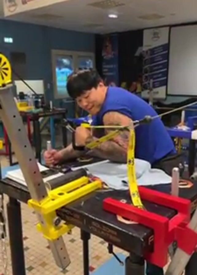 A middle-aged Asian man wearing a blue t-shirt, with black hair and extensive tattoos on both arms, is seated at an arm wrestling table