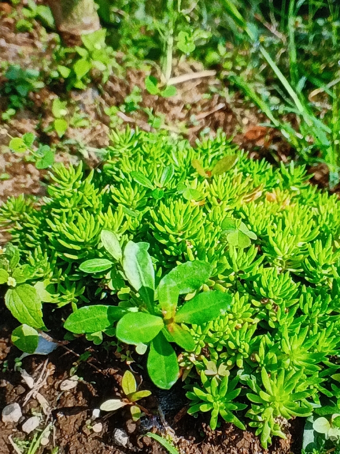 This image depicts a close-up, overhead view of ground vegetation in Taungpi, Myanmar (Burma). The central and lower-right portions of the frame are dominated by a dense, bright green mat of small, succulent-like plants characterized by numerous short, fleshy leaves. In the lower-left foreground, a larger, darker green plant with four distinct, broadly ovate leaves is visible, growing amidst smaller shoots. The plants are rooted in dark brown soil, which is exposed in the upper half and lower-left corner, revealing small stones and organic matter. Scattered individual green leaves and small sprouts are interspersed within the soil areas. The scene is brightly illuminated, indicating natural light. No human figures, animals, or artificial objects are present.