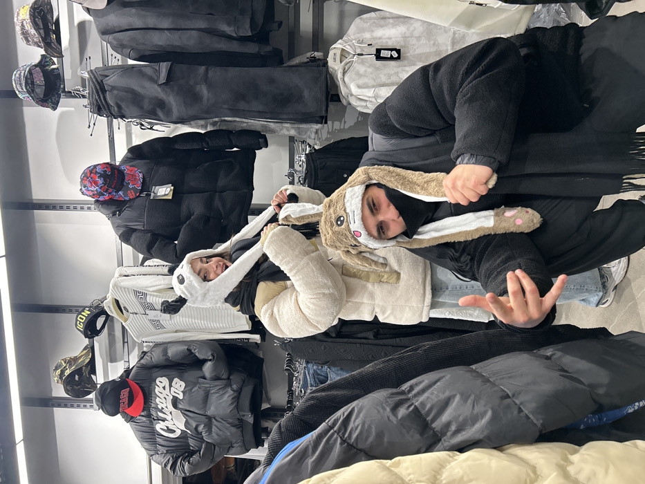 The image depicts two individuals inside a clothing store in Strasbourg, France. In the foreground, a male in a black fluffy jacket, dark scarf, and dark pants is crouching, wearing a brown rabbit-eared hat. His right hand is raised, displaying a hand gesture with extended thumb, index, and pinky fingers. He looks directly at the camera. Behind him, slightly to the left, a female is standing, wearing a cream-colored textured jacket over a dark scarf and light-colored jeans. She wears a white panda-eared hat with long flaps, which she is holding with both hands, and is smiling towards the camera. The background features clothing racks and shelves displaying various garments including black puffer jackets, one with "Chicago 08" lettering, a white patterned sweater, dark sweatpants, and a white tie-dye hoodie. Several caps and hats are also visible on display, including a red-brimmed black cap, a camouflage bucket hat, a black "ICON" cap, and a red and blue patterned cap. Price tags are visible on multiple items. The setting is illuminated by overhead lighting.