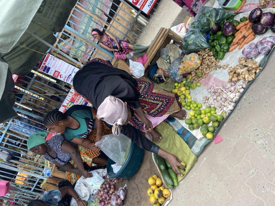 The image depicts an outdoor market stall in Dar es-Salaam, Tanzania, operating beneath a green overhead canopy