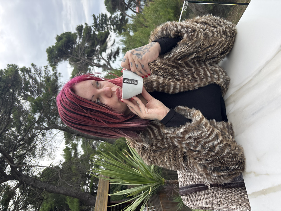 A female individual is seated outdoors at a white marble-patterned table on an elevated terrace in Ulcinj - Ulqin, Montenegro. She possesses bright pink hair with visible darker roots/streaks, and her fingernails are painted red. She wears a brown and white striped faux fur jacket over a black long-sleeved top. Tattoos are visible on her left hand and forearm. The individual holds a white coffee cup, branded "MOKADOR," to her lips, appearing to be in the process of drinking. Her gaze is directed off to the right. A brown wicker chair is partially visible to her left, with a dark brown leather bag hanging from it. The background consists of dense evergreen trees, primarily pines, under an overcast sky. A palm-like plant and a wooden structure are visible on the left, while a transparent glass railing is present on the right, suggesting a scenic overlook.
