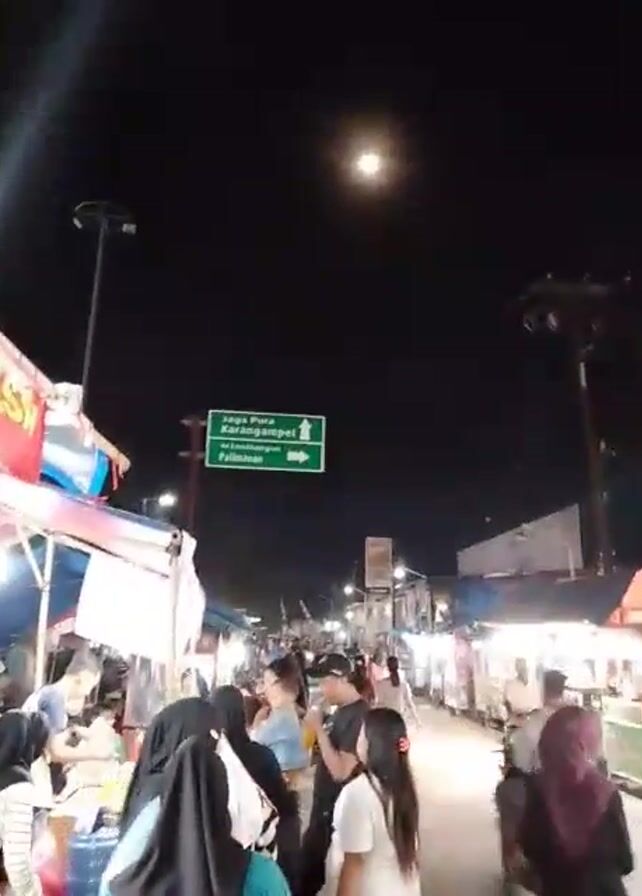 crowded street market at night. People walk around, many wearing hijabs. There are food stalls with colorful awnings and bright lights. Motorcycles weave through the crowds. The sky is dark with a bright full moon. Streetlights illuminate the scene. A green road sign points in one direction.