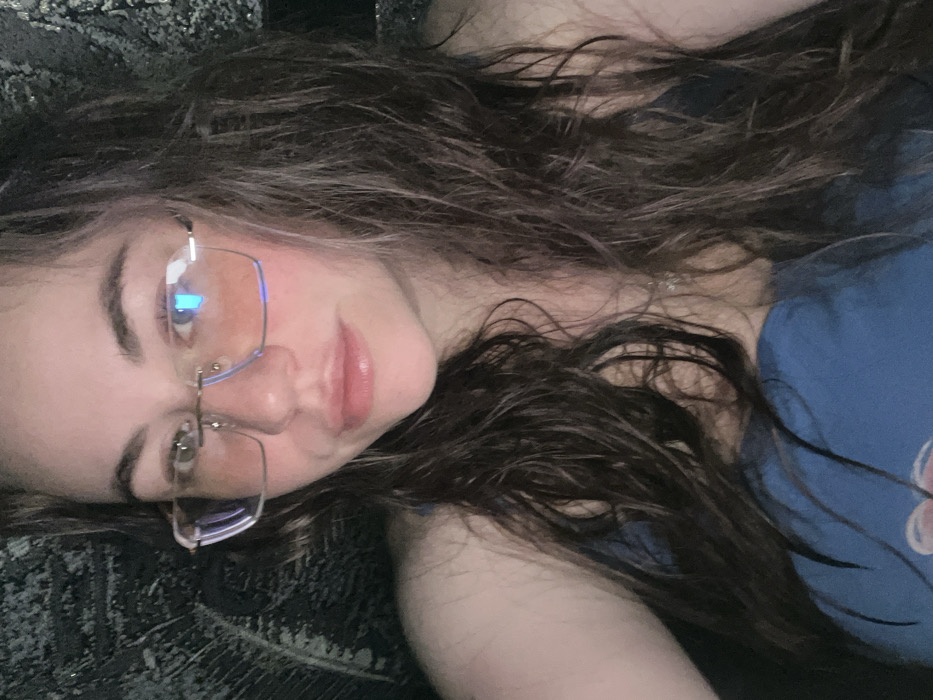 An image depicts a young adult female, observed from the chest up, positioned in an indoor setting within the city of Chaikovsky, Russia. She has fair skin, a neutral facial expression with full lips, and long, wavy, dark brown hair that appears damp, falling over her shoulders and chest. She wears rimless, rectangular glasses with a metallic, possibly gold-colored, bridge, exhibiting blue light reflections on the lenses. Her attire consists of a dark blue top, likely a t-shirt or tank top, with a partially visible red and white graphic on the chest. The background is dark and features a subtle, textured pattern, indicative of wallpaper or fabric. Lighting conditions are dim, with an artificial light source contributing to the reflections on her glasses.