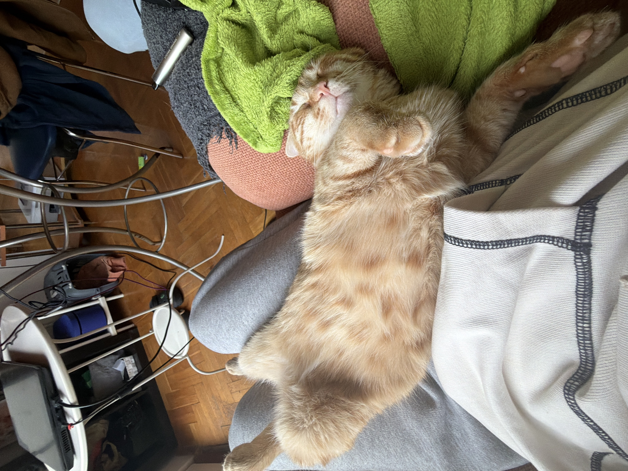 A ginger cat is sleeping on a chair. The chair has a gray cushioned seat, a coral back, and a green towel draped over it. The cat is lying on its back with its paws crossed over its chest. The background is blurry, but a table with various objects on it can be seen. The location is Sofia, Bulgaria.