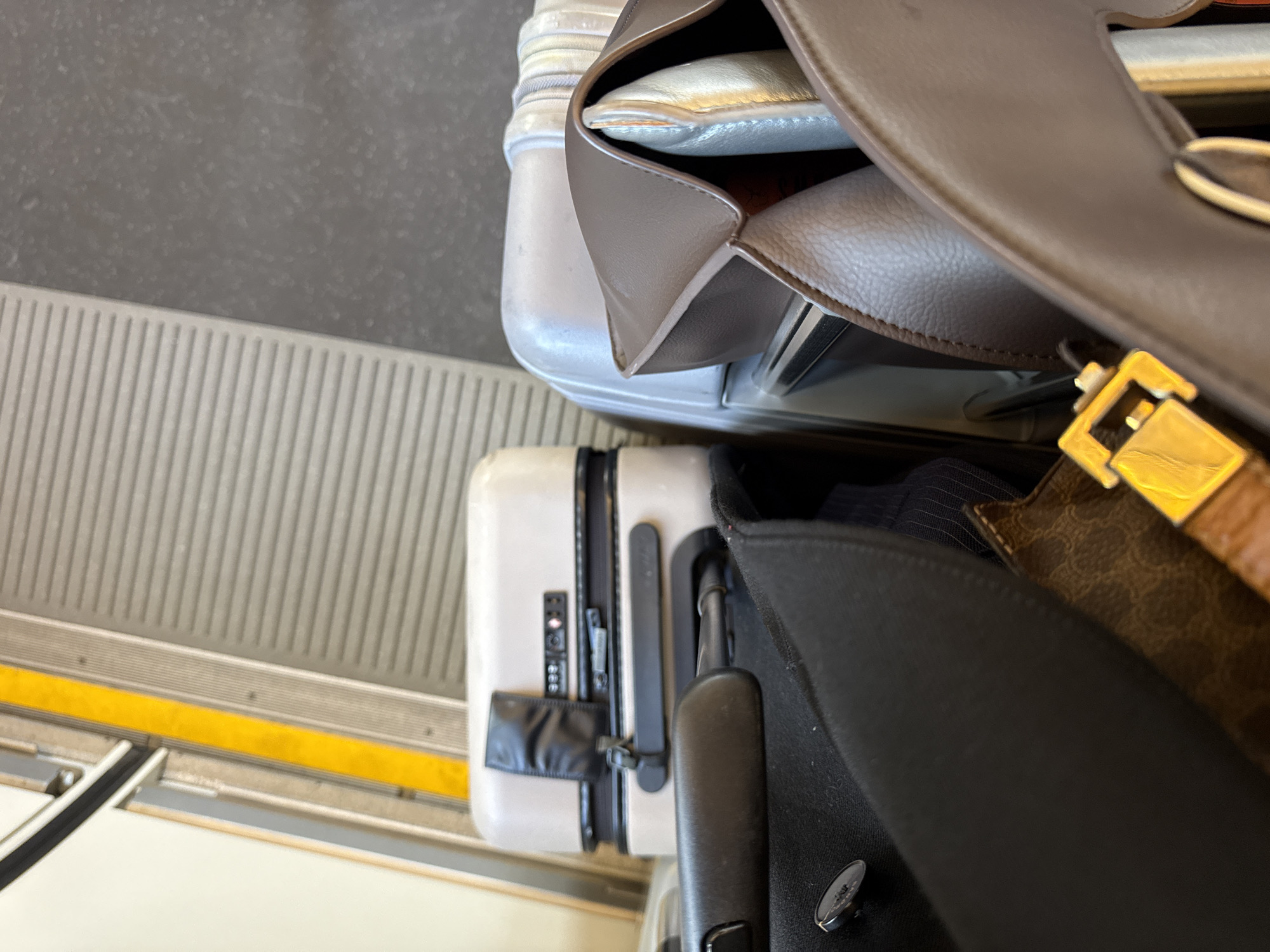 The image depicts an overhead shot of luggage on what appears to be a train in London, United Kingdom. A light grey suitcase with black straps and handle sits on the floor near a yellow line on the train. On top of it, rests a large, structured brown handbag with a tan leather strap and gold buckle. A dark jacket is partially visible inside the handbag. The flooring next to the train features a ribbed metal design.