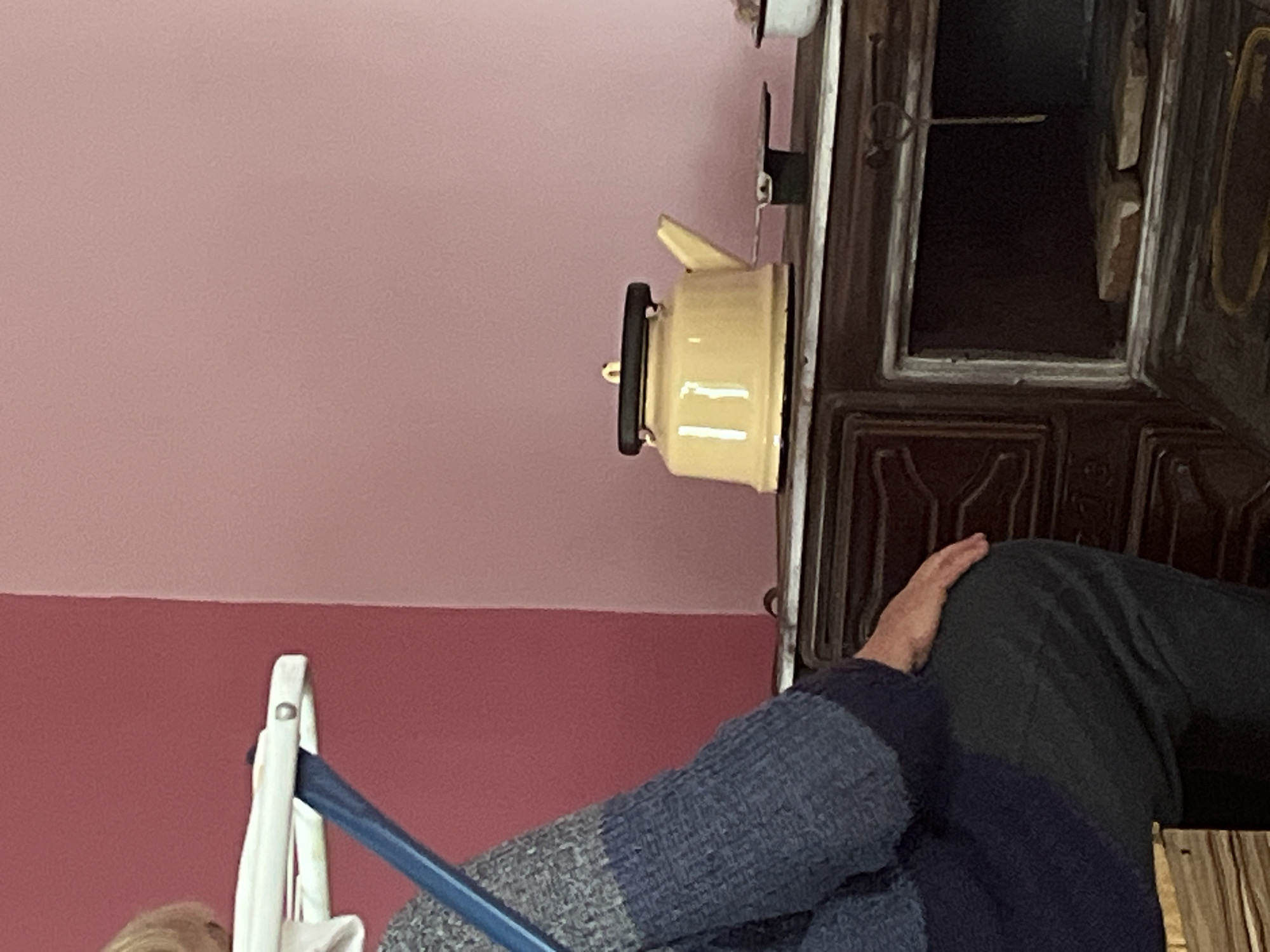 The scene depicts an interior space in Balgarin, Bulgaria. The background features a wall partitioned vertically into a darker red section on the left and a lighter pink section on the right. In the foreground, a person is seated on a light-colored wooden surface on the left. Only the left side of their upper torso, arm, and leg are visible. They wear a knitted sweater composed of grey and blue sections and dark-colored trousers. Their right hand rests on their right thigh. Near their upper body, a white, horizontally oriented object with a curved end and a small silver stud is supported by a blue rod, consistent with part of an ironing board or clothes drying rack. On the right, a dark brown, possibly cast iron, stove or oven occupies the central foreground. A yellow enamel kettle with a black lid and handle is positioned on its top surface. To the right of the kettle, a small dark metal trivet and a partially visible white enamel bowl containing light-colored contents are present. The lower oven door of the stove is open, revealing a dark interior containing two light-colored rectangular objects and a hanging metal ring handle.
