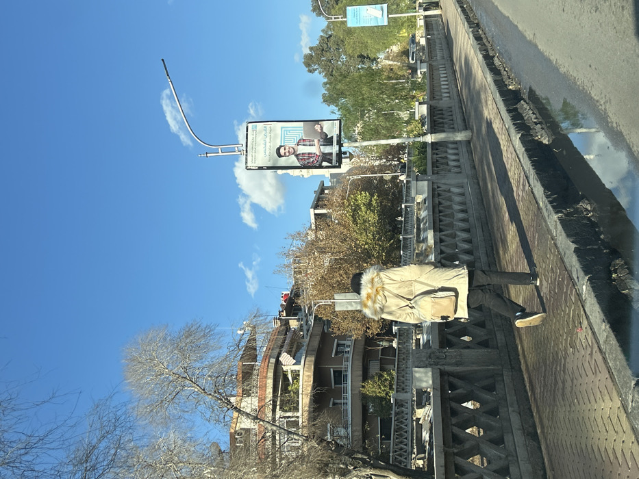 The image depicts an urban street scene in Al-Muhajerin Municipality, Syria, under a clear blue sky with scattered white clouds. A single individual, viewed from behind, is walking from right to left on a reddish-brown brick-patterned sidewalk. The person wears a long, light-colored (possibly beige or cream) winter coat with a prominent light-colored faux fur trim on the hood, dark pants, and dark shoes. A light-colored backpack with darker straps is worn on their back. To the left of the pedestrian, a low, decorative concrete barrier with repeating diamond-shaped cutouts extends along the length of the sidewalk. Beyond this barrier, several large, bare deciduous trees are visible, indicating a non-summer season. In the background, multi-story buildings with multiple balconies are present, one featuring distinctive curved balcony designs. To the right of the sidewalk, a dark concrete curb separates it from a section of the street containing a significant puddle of standing water, which reflects the blue sky and clouds. Further down the street, a metal lamppost holds a vertically oriented rectangular billboard displaying a smiling male subject holding a laptop, accompanied by Arabic text. A second, smaller billboard is visible further in the distance on the right side of the street. The scene is brightly lit by sunlight.