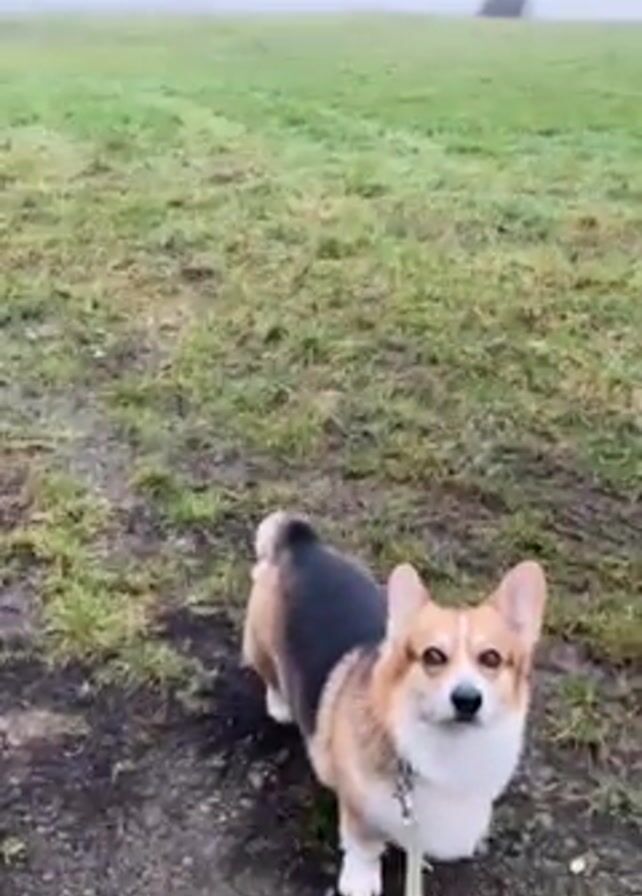 The video opens with a close-up shot of a corgi standing on a muddy patch of land, wearing a harness and leash