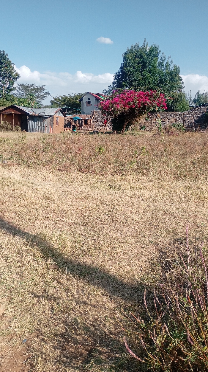 A sunlit, rural landscape with a dry, grassy field taking up most of the frame. Beyond the field is a cluster of humble dwellings with corrugated metal roofs. A stone wall borders the houses, partially obscured by a vibrant pink bougainvillea bush. A large tree looms behind the wall, adding depth to the scene. The sky is clear blue with scattered clouds, suggesting a warm, dry climate. A shadow stretches across the foreground grass.