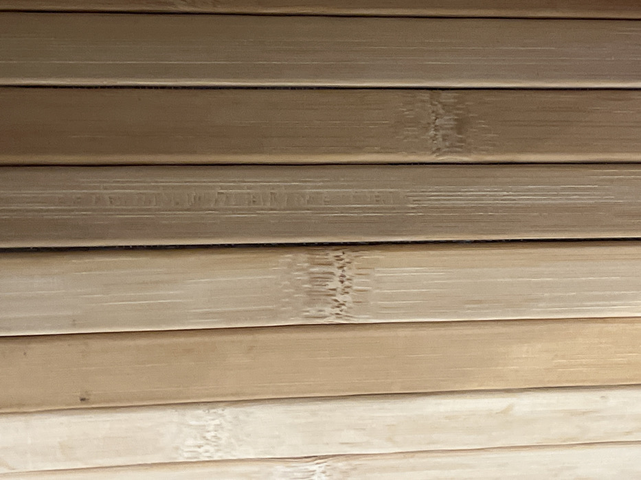 The image displays a vertical, close-up view of a surface composed of multiple light-brown bamboo elements