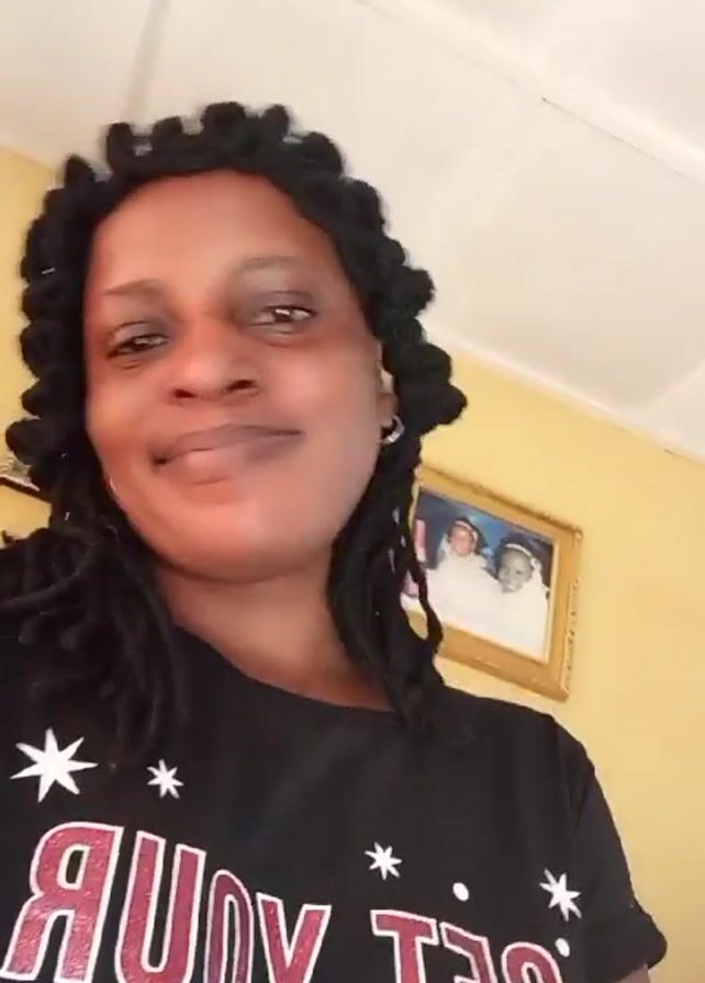 A woman in a black t-shirt is standing in front of a yellow wall with a framed picture on it. The t-shirt has the words "GET YOUR" printed backwards in large red and white letters. She has dark hair styled in braids or twists. The room has a white, paneled ceiling. She is looking at the camera with a slight smile. Music is playing in the background.