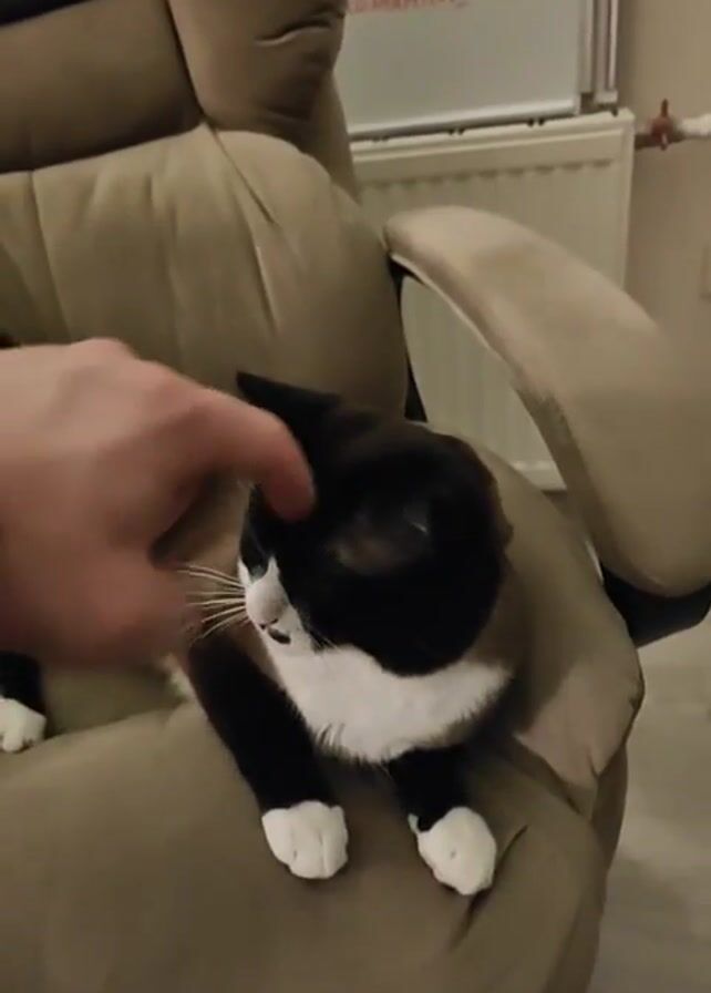 The scene captures a person interacting with a cat in an indoor setting. The cat, with a distinctive black and white coat, sits comfortably in a tan-colored office chair, resting its paws neatly in front of it. The individual's hand, visible in the frame, gently pets and nudges the cat. The cat responds by slightly moving its head. The background includes a white radiator, part of a whiteboard with writing, and some indistinct elements, which, along with the chair, give the impression of a typical indoor room. The camera remains steady, focusing primarily on the interaction between the person and the cat.