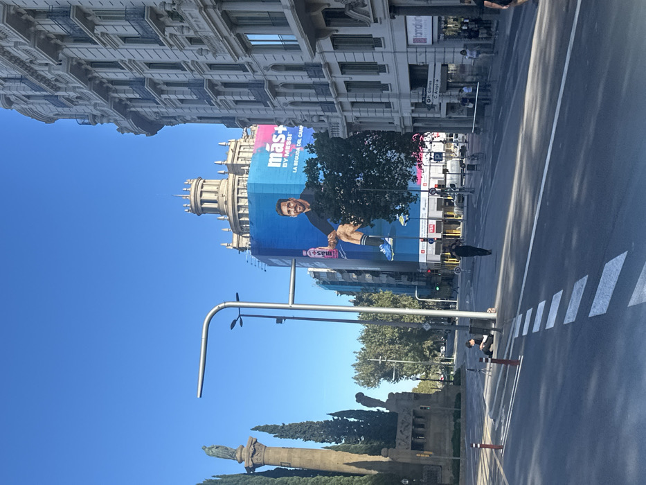 The image depicts a daytime street scene at Plaça de Mossèn Jacint Verdaguer, Barcelona, Spain, looking down Avinguda Diagonal. A clear blue sky is visible above. In the foreground, an asphalt road with a white dashed pedestrian crossing occupies the lower frame. On the left curb, a person in dark clothing sits next to a street lamp pole, observing a small tripod-mounted device. Red and white striped bollards are also visible. On the right, a person walks away from the camera on the road, while other pedestrians are on the sidewalk. An ornate multi-story building with balconies lines the right side, featuring shopfronts, including one labeled "farmàliavin," and a street sign indicating "Pl. Glòries" and "C. Aragó." The midground left features a tall stone column topped with a statue of the Virgin Mary, identified as the Monument a la Immaculada Concepció, flanked by slender evergreen trees. A prominent modern street lamp post stands centrally. To the right, a large building is largely covered by a vibrant blue billboard. This billboard displays a large image of Lionel Messi, holding a pink "más+ by Messi" bottle, with the text "LA BEGUDA DEL CAMPIÓ" (The Champion's Drink). Below the billboard, traffic lights and street signs are present. In the background, the distinctive circular, domed, and turreted roofline of the Casa de les Punxes (Casa Terrades) is visible above the billboard. Distant buildings and trees line the street, receding into the background.