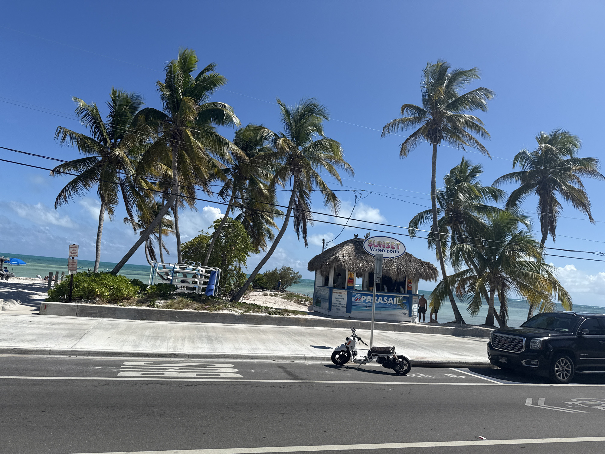 The image captures a bright, sunny day in Key West, Florida, United States of America. The scene is oriented along a street parallel to a shoreline. Several palm trees are planted along the edge of the beach, bordering the road. A small hut with a thatched roof serves as a booth for "Sunset Watersports," offering parasailing and beach rentals. A three-wheeled scooter is parked near the booth. To the right, a black GMC Denali is parked along the curb. In the background, beyond the trees, the ocean is visible with a few people on the beach. Power lines traverse the top of the frame. The road is asphalt with painted white lines.