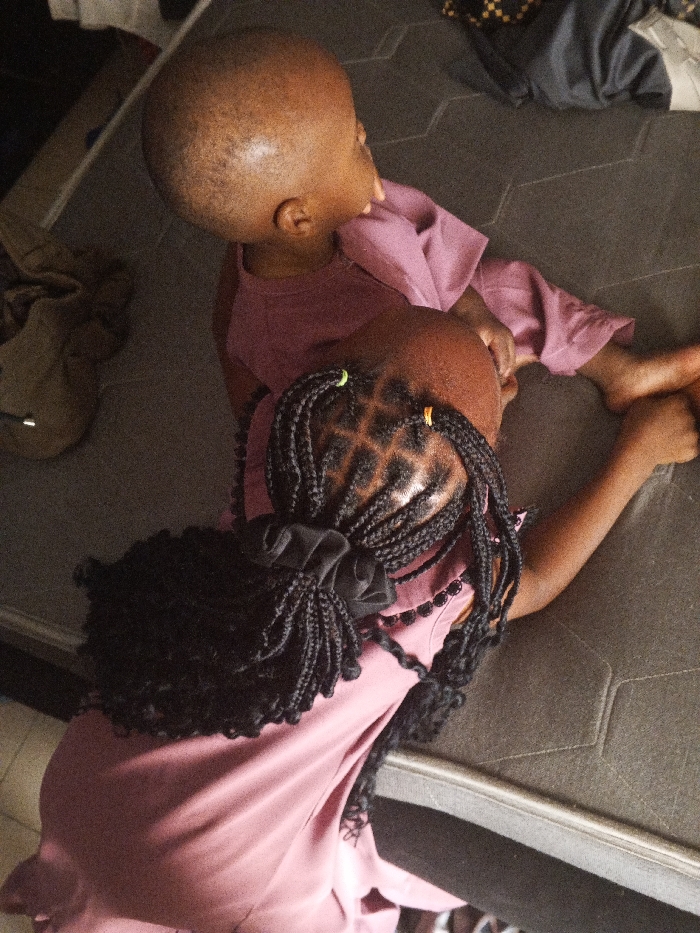 The image, taken in Lokoja, Nigeria, shows two dark-skinned individuals, consistent with children, seated on a dark gray mattress with a geometric quilted pattern. The foreground individual is seen from behind, exhibiting black braided hair with green and yellow elastic bands, secured by a black scrunchie. This individual wears a pinkish-mauve long-sleeved garment, and their head is angled towards the mid-section of the second individual. The second individual, partially obscured behind the first, displays a closely shaved head and wears a short-sleeved pinkish-mauve top and matching pants. Their gaze is directed towards the right of the frame. The environment includes a brown object on the left and dark fabric on the upper right.