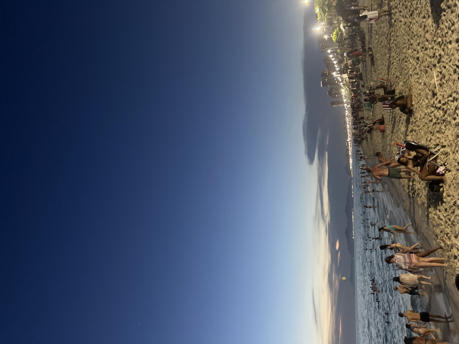 A beach scene at dusk. The sky transitions from dark blue to pale orange near the horizon. People are on the beach, either in the water or relaxing on the sand. A line of lights stretches along the shoreline, likely from buildings or streetlights. The beach appears crowded with many people enjoying the evening.