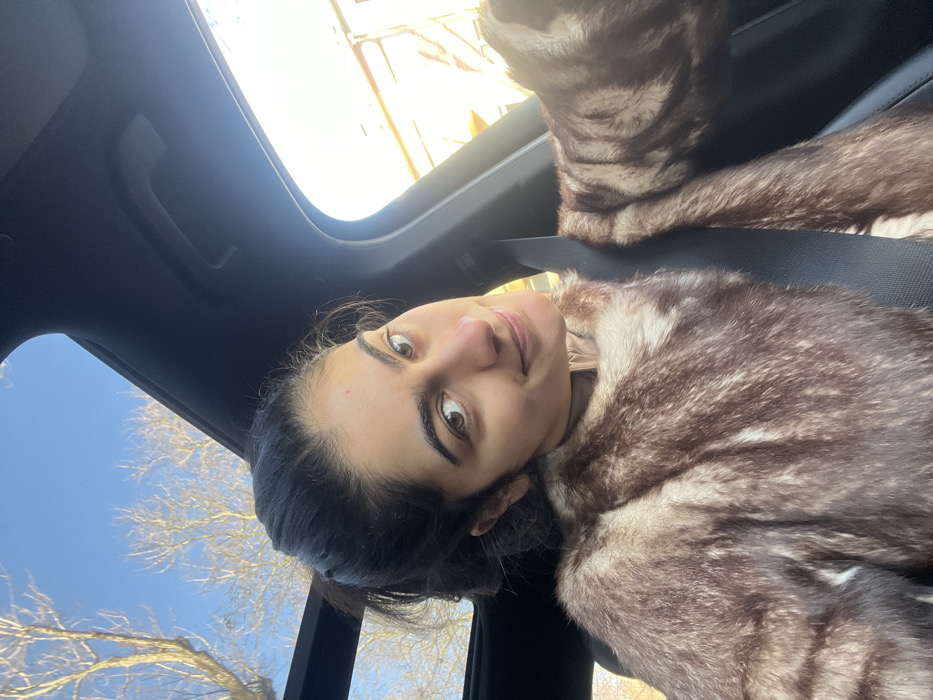 The image presents a female subject, likely in her twenties or thirties, seated in the front passenger position of a vehicle