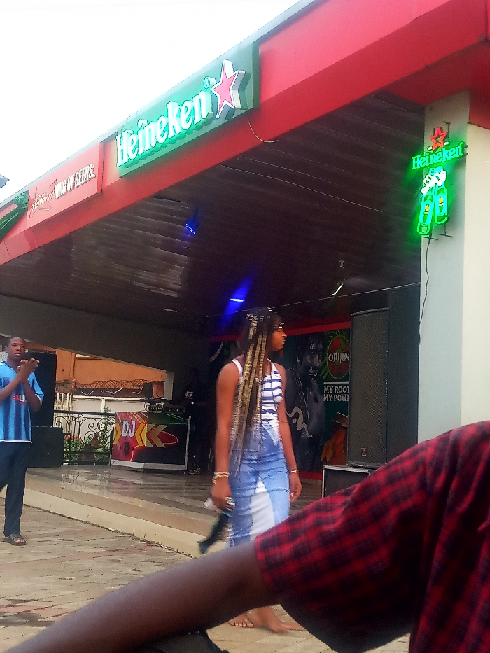 Outside an establishment with a "Heineken" sign, a woman in a striped top and denim skirt walks barefoot, holding a microphone. A man in a blue shirt claps nearby. A DJ booth and speakers are visible in the background. The building features a red awning and a neon "Heineken" light fixture. The image is partially obscured by a person in a red plaid shirt in the foreground.