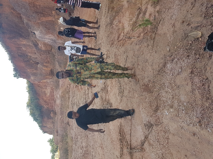 The image depicts an outdoor scene in Sabon Gari Nassarawa, Nigeria, characterized by dry, reddish-brown earth and a prominent eroded cliff face in the background. The ground is uneven, with scattered debris and sparse dry vegetation. In the foreground, two males walk rightward across the frame. The male on the left wears a black t-shirt, dark distressed jeans, and dark sandals, holding a dark blue object, possibly a mobile phone, in his left hand. The male in the center wears a full camouflage military-style uniform and light brown boots, holding a dark object resembling a firearm or prop rifle in his right hand, pointing downwards. To the right and further back, several individuals are present. One male wears a white t-shirt with "30" printed on it and dark shorts, carrying a black sling bag. Another male wears a dark t-shirt and purple shorts. A female wears a black top, dark skirt, and a white head covering. Another female wears a striped top and dark pants. Additional figures are visible in the background near the cliff base. The overall environment suggests an arid or semi-arid region with significant geological features.