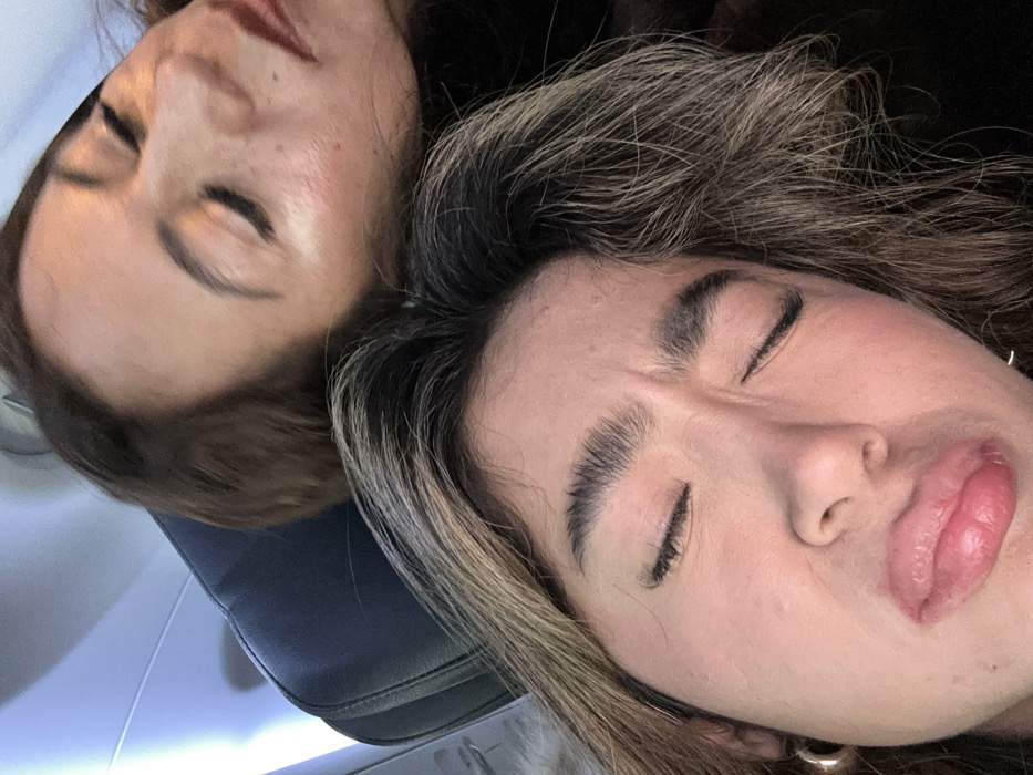 This image depicts two individuals, likely women, inside an airplane cabin