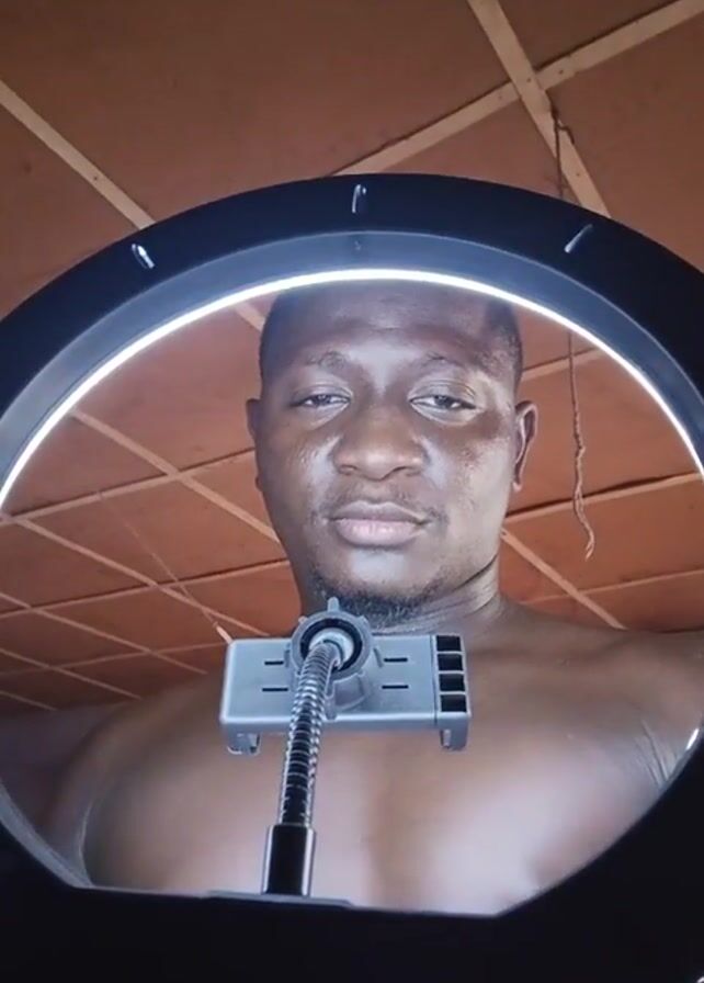 A man is standing in front of a ring light with a phone holder. He is shirtless. The camera is positioned behind the ring light, looking up at the man. The background shows a ceiling with brown tiles and exposed wooden beams. The man is staring directly at the camera, and the ring light is illuminating his face. The phone holder attached to the ring light is empty. A wire hangs down from the ceiling.