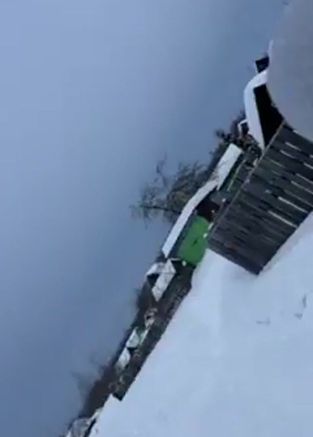 A woman in a white puffer jacket and glasses is walking through a snow-covered area