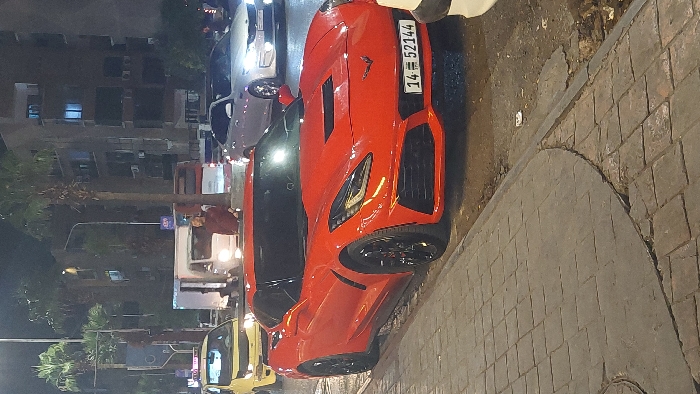 The image depicts a nighttime street scene in Barza Municipality, Damascus, Syria. A red Chevrolet Corvette C7 sports car, equipped with black multi-spoke wheels, is parked on a grey paved sidewalk. The vehicle's front displays Syrian license plate "14 52144". The street surface is wet, reflecting artificial light sources. To the left of the Corvette, a yellow compact vehicle and a white commercial van are visible, both with activated headlights. Further into the background, a silver sedan with illuminated headlights is present on the street. One adult male, with short hair and a beard, wearing a dark red long-sleeved shirt, stands on the street near the white commercial van. Multi-story buildings with illuminated windows and several palm trees line the street in the background. The sidewalk is constructed from rectangular pavers, exhibiting signs of wear.