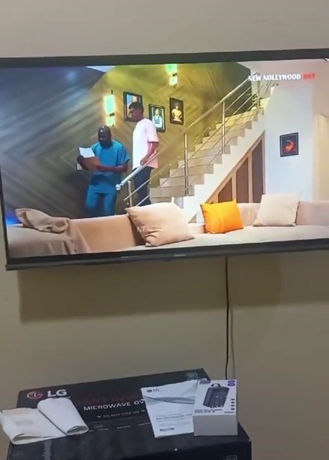 wall-mounted LG television that is displaying a scene from a TV show, seemingly Nigerian. The TV show appears to be set in a modern living room with a staircase, a sofa, and portraits on the wall. Two men are in the scene; one dressed in blue scrubs is holding a document and seemingly talking to another man in a white t-shirt and black pants. Below the television are two LG branded boxes, one for a microwave oven. There's also a small box next to the microwave oven, possibly containing a product, but the label is unclear. The wall appears to be painted a neutral beige color. A power cable is visible running down from the TV to a power source. The room appears to be in a home setting.