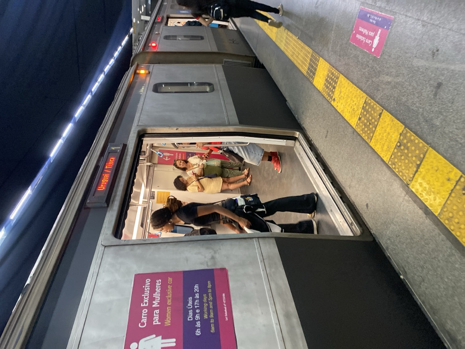A subway car is partially visible, showing passengers inside. A sign on the car indicates it's a women-only car during certain hours. The sign, written in Portuguese and English, specifies "Working days" between "6 am to 9 am and 5 pm to 8 pm." The destination display reads "Uruguai/Tijuca." A yellow textured strip is present on the platform edge for safety.
