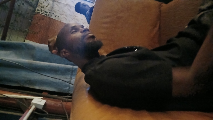 A man with a beard rests on an orange couch. He wears a black shirt. Another person wearing a blue shirt and a black hat is visible in the background. The surrounding area is cluttered with various objects, including what appears to be a blue tarp or sheet, some pipes or poles, and a white electrical outlet. The scene suggests an indoor environment, possibly a living room or recreational space.