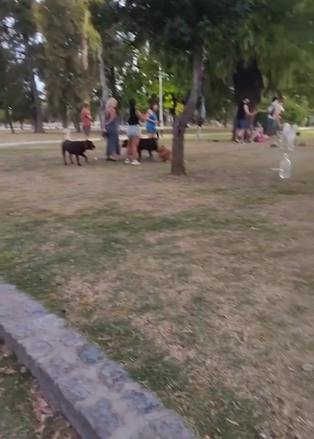 - "park scene. There are several people standing around with dogs. The dogs vary in color and size, including black, brown, and white. Some people are standing in groups, while others are seated on the grass. There are trees scattered around the park. The grass appears dry in places. There is a plastic water bottle and a blue plastic bowl on the ground. A low concrete barrier lines the edge of the grassy area." by FM-NSjnv2, licensed under CC BY 4.0
