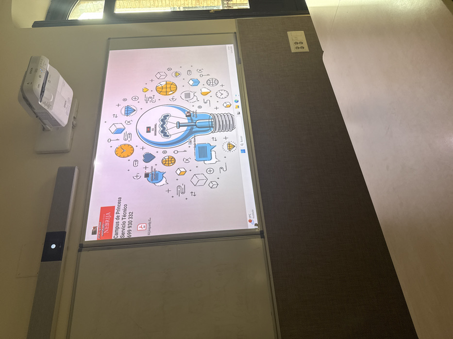 A projector is mounted on the wall above an interactive whiteboard. The whiteboard displays a graphic of a lightbulb surrounded by icons, including clocks, diamonds, speech bubbles, and cubes. The logo of "NEBRIJA Campus de Princesa Servicio Técnico 699 930 332" is displayed in the lower left corner. Next to the whiteboard, a speaker bar is vertically mounted on the wall. Above the projector is a window with an arched top.