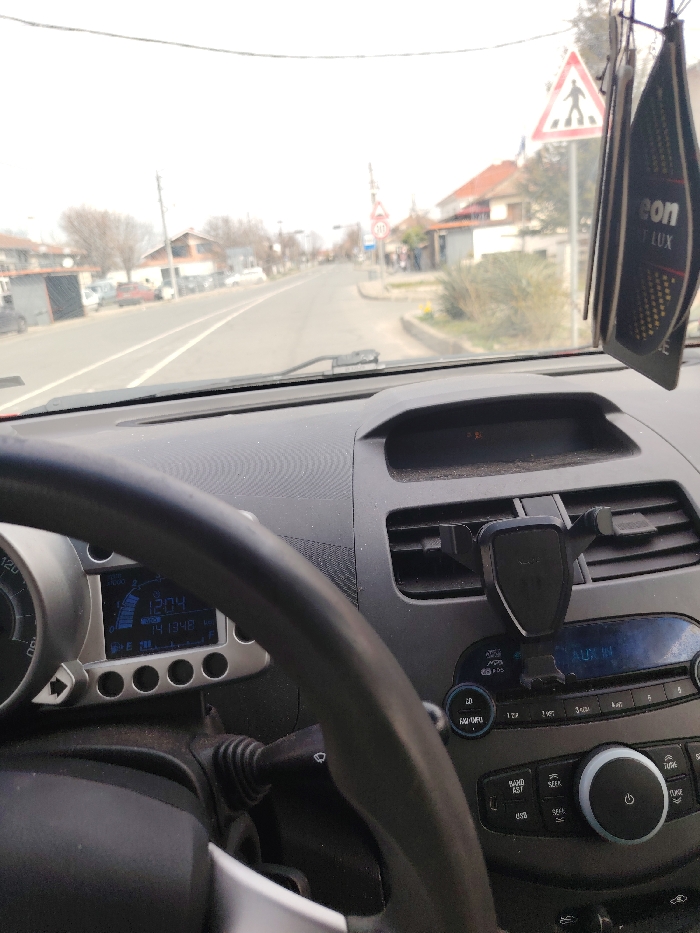 The image presents a driver's perspective from within a vehicle, likely in Marinka, Bulgaria, looking forward down a paved road under an overcast sky