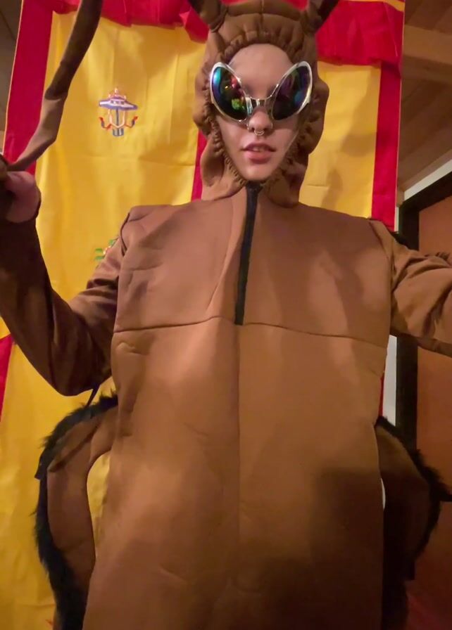 A person wearing a brown insect costume with bug eye sunglasses stands in a room with a yellow, red, and white Tibetan thangka hanging in the background. The costume has antennae, a hood, and furry insect legs attached to the sides. The person moves slightly and then approaches the camera with a growling sound.