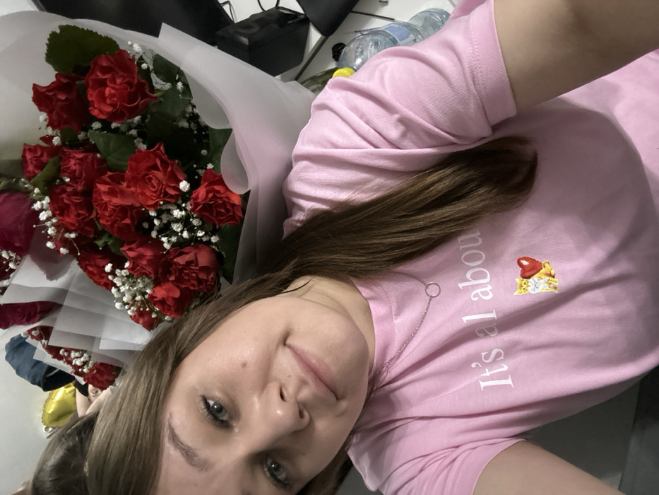 The image depicts a young adult female in an indoor setting within the city of Chaikovsky, Russia. She is captured in a close-up, upward-angled selfie. She has light skin, blue eyes, and long, straight light brown hair flowing over her right shoulder. Her expression is neutral with a slight smile. She wears a light pink short-sleeved t-shirt with partially visible white text "It's all abou" and a graphic featuring a small orange cat next to a red heart balloon. A silver-colored chain necklace with a circular pendant is visible around her neck. To her upper right, a large bouquet of red roses with white filler flowers, wrapped in white translucent material, is prominently displayed. In the upper left background, a partially deflated gold balloon is visible. To the right background, a clear plastic water bottle with a yellow cap stands beside dark objects, likely furniture or electronics.