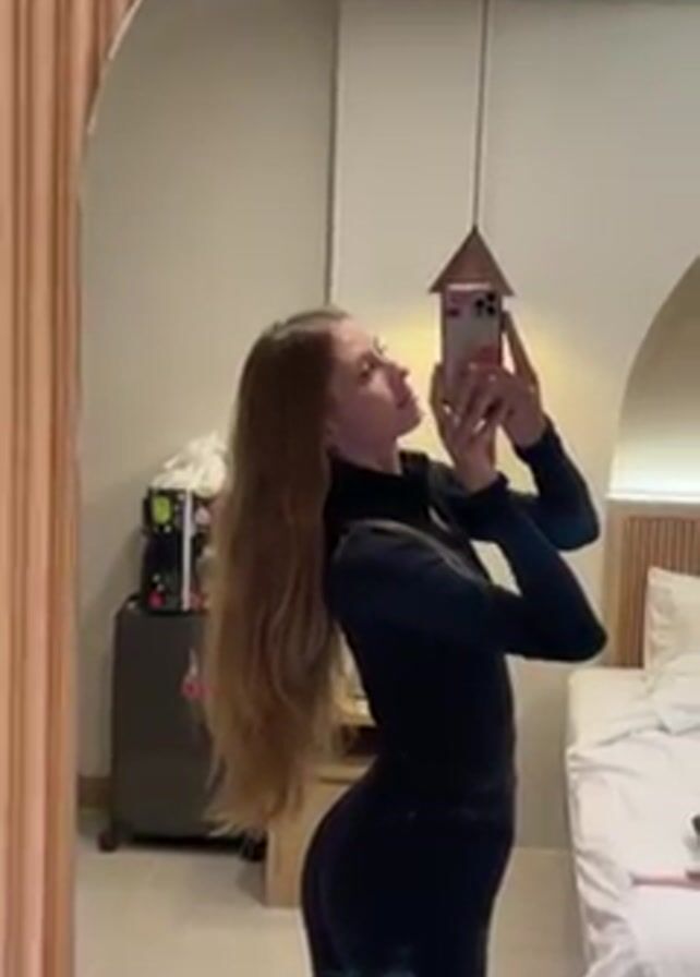 A young, thin woman with long, light brown hair stands in front of a tall, arched mirror, taking a selfie with her phone. She is wearing a tight, long-sleeved black shirt and black leggings. The room appears to be a hotel room, with a bed visible on the right, a suitcase and a gift bag in the background, and a hanging light fixture. The walls are light-colored, and the floor is tiled. The woman is looking at herself in the mirror, holding her phone up to capture the image.