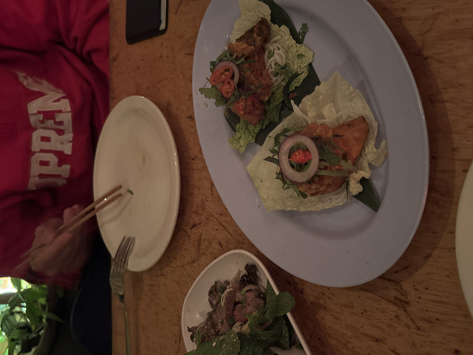 A top-down shot showcases an array of culinary delights. A person in a red sweater uses chopsticks near a clean, white plate with a fork. A larger, light blue plate displays two lettuce wraps with what appear to be onion rings and meat. Below, a white bowl holds a salad with leafy greens and what may be thinly sliced meat. All is set on a light brown wooden surface.
