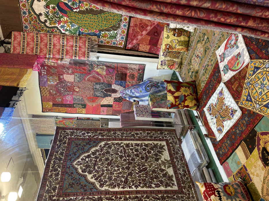 The image displays the interior of a textile shop in Pokhara, Nepal, densely filled with various woven and embroidered goods